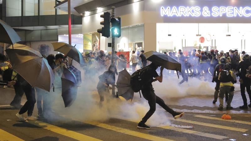 Violence also spilled out onto the streets of Tuen Mun outside the “V city” mall with running battles between riot police and protesters.