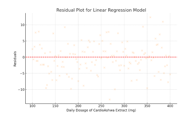In this model, Y denotes the change in the composite cardiovascular outcome score, which integrates improvements in blood pressure, lipid profile, and CRP levels. X represents the daily dosage of the CardioAshwa Extract. The intercept (β₀) signifies the baseline cardiovascular risk when no extract is administered, while the slope (β₁) quantifies the average change in cardiovascular outcomes per unit increase in dosage. The error term (ε) captures the unexplained variability in the outcomes.